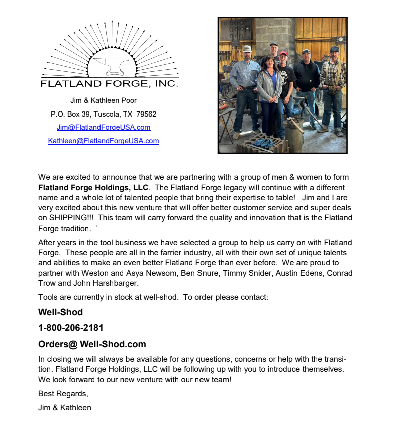 Welcome to Flatland Forge! We specialize in premium forging tools for the horseshoeing and blacksmithing trades. Visit our store to make a secure online purchase, check out our handmade knives, and consider getting your new tools customized on our laser engraving tab.